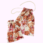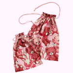 前当てにははしごリボン、ピンクにはアカ・サックスにはピンクのチェリー、シャーリーテンプルの昔ながらの甘いディティールを込めました