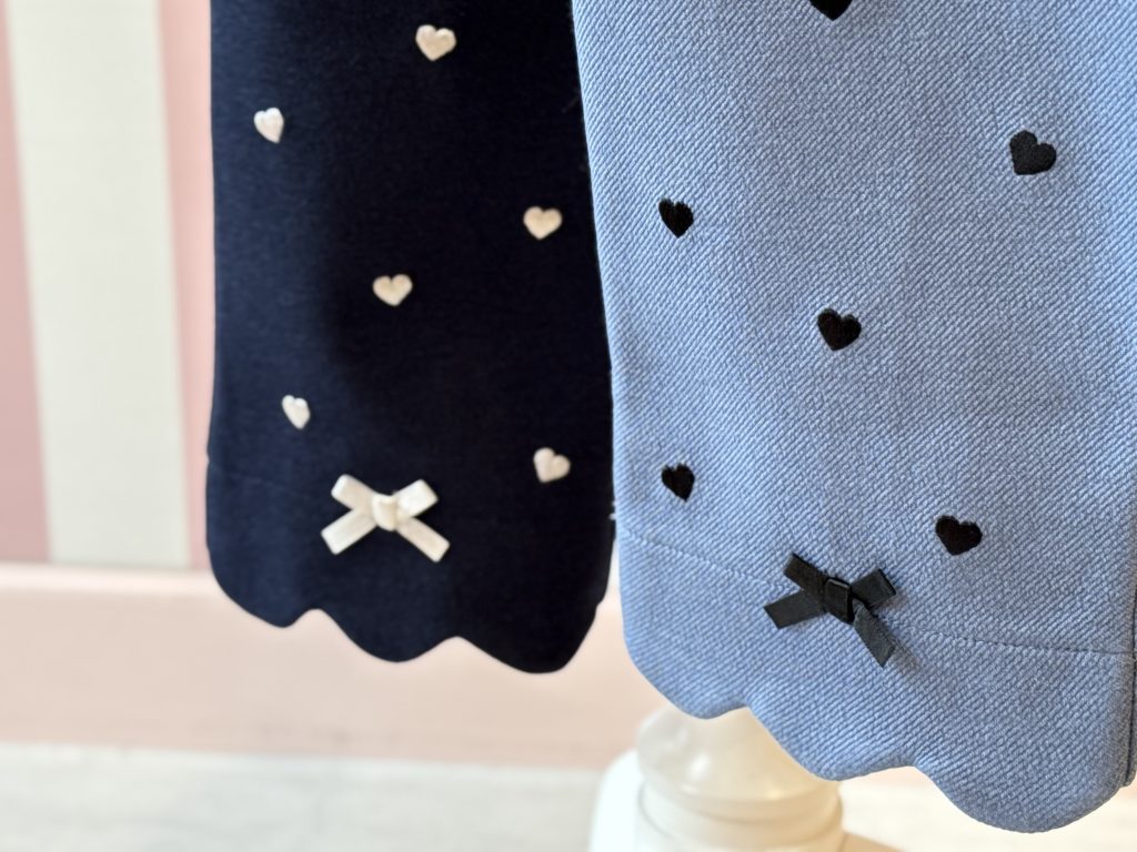 一見シンプルなこちらのパンツは裾のスカラップにハート刺繍とプチリボンをトッピングしています♡