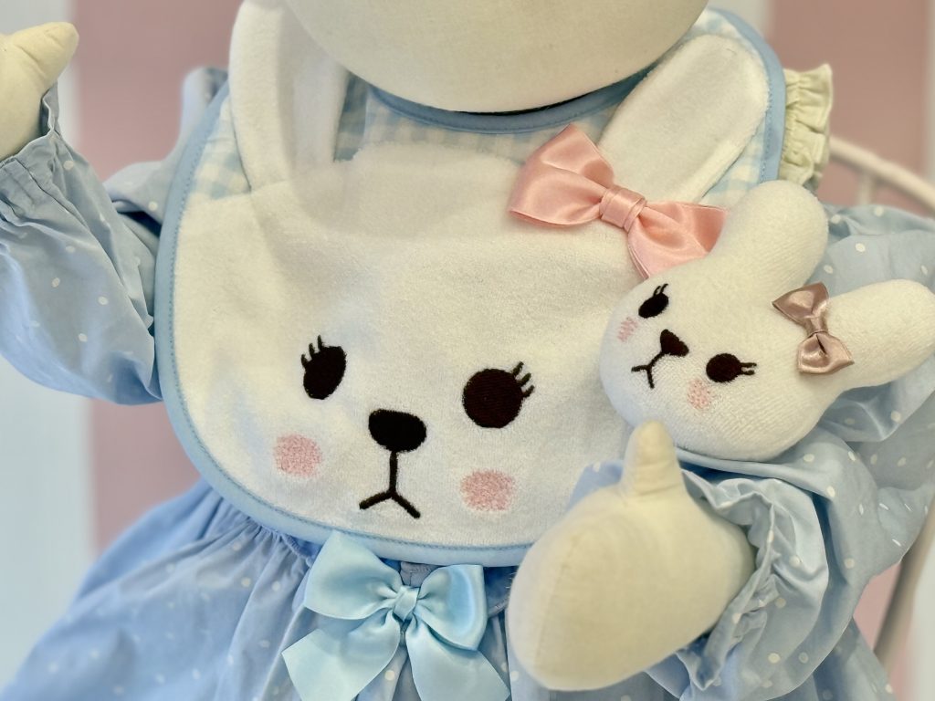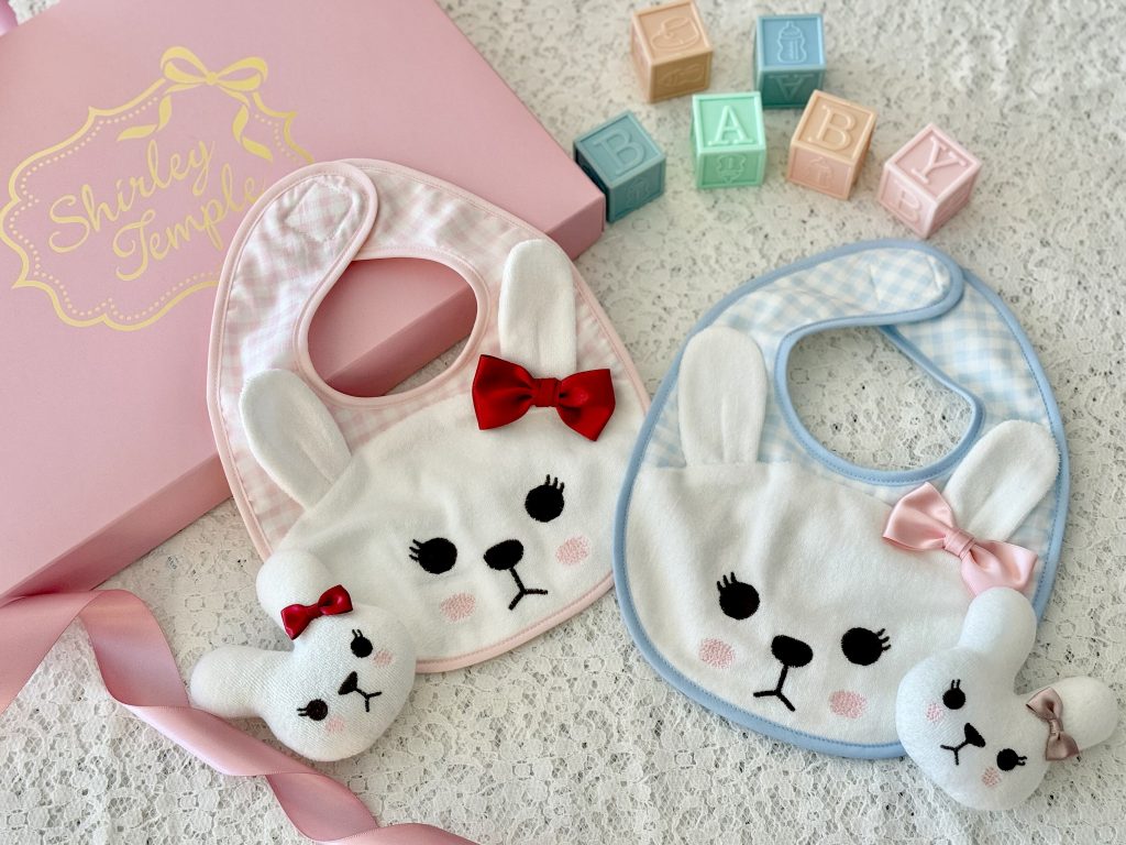 スタイ、ラトルともにシャルロットちゃん部分はやわらかなパイル生地を使用しています🍼