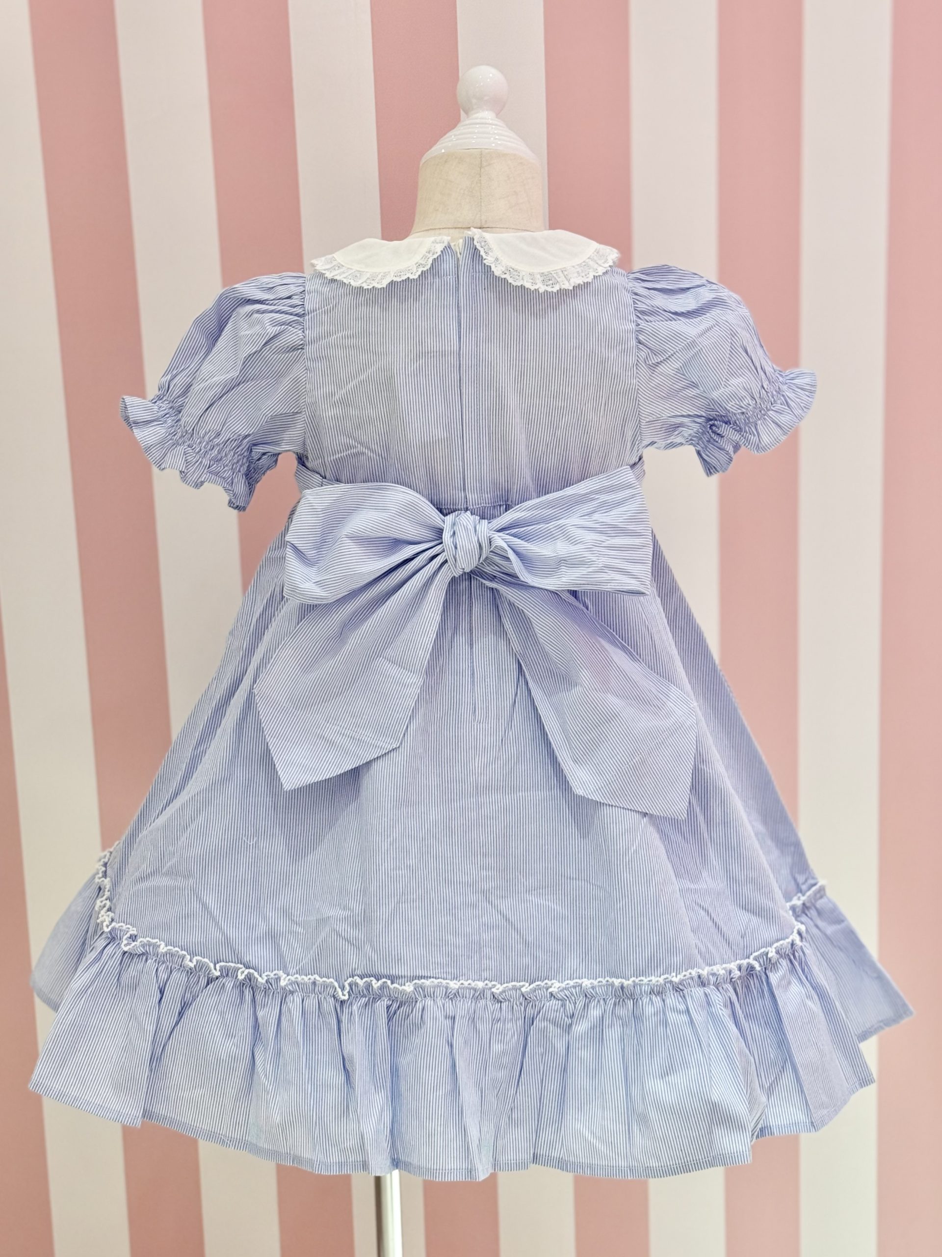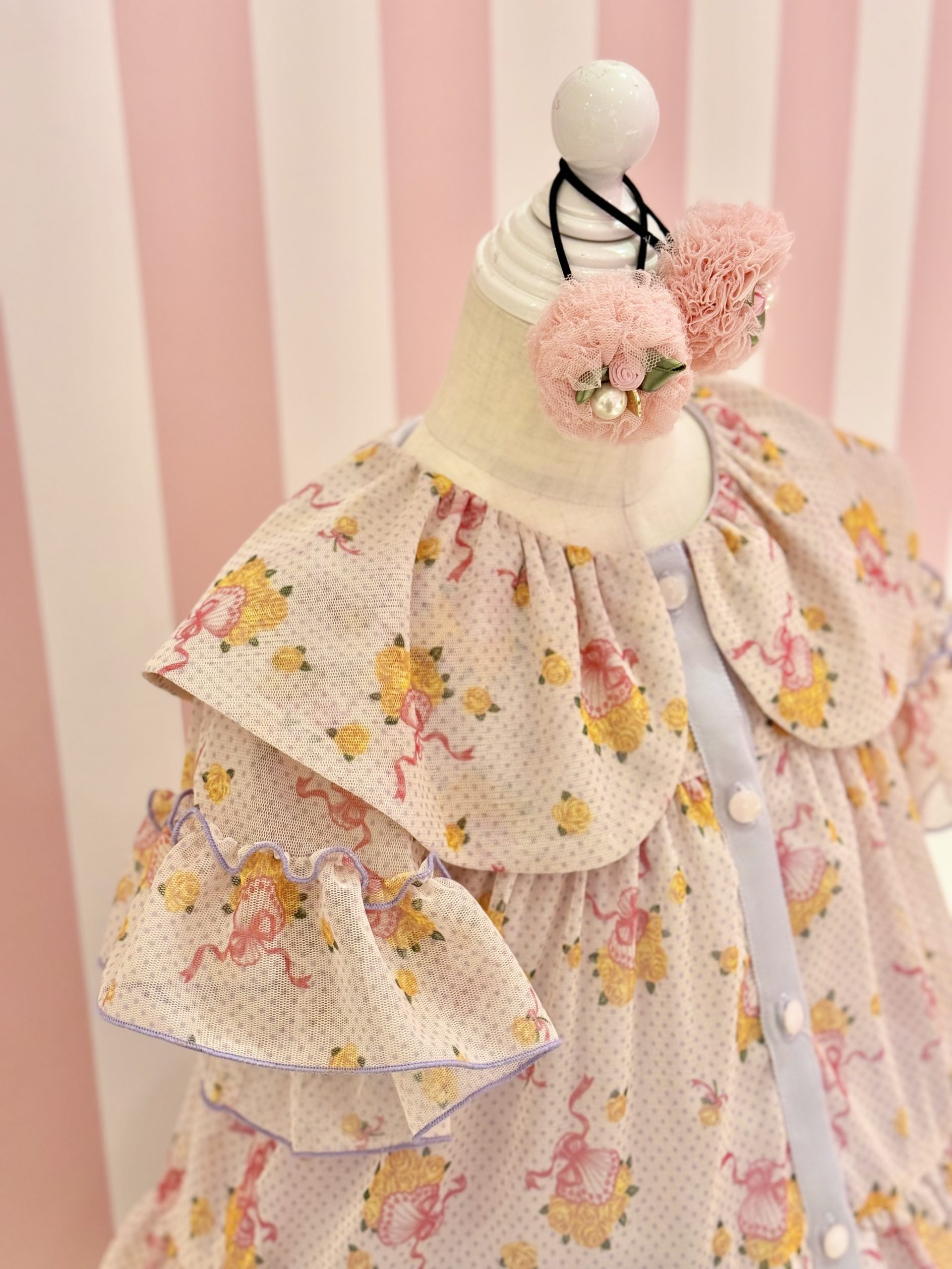 いつもより少し控えめな丸襟にウエストには大きなリボン![]()