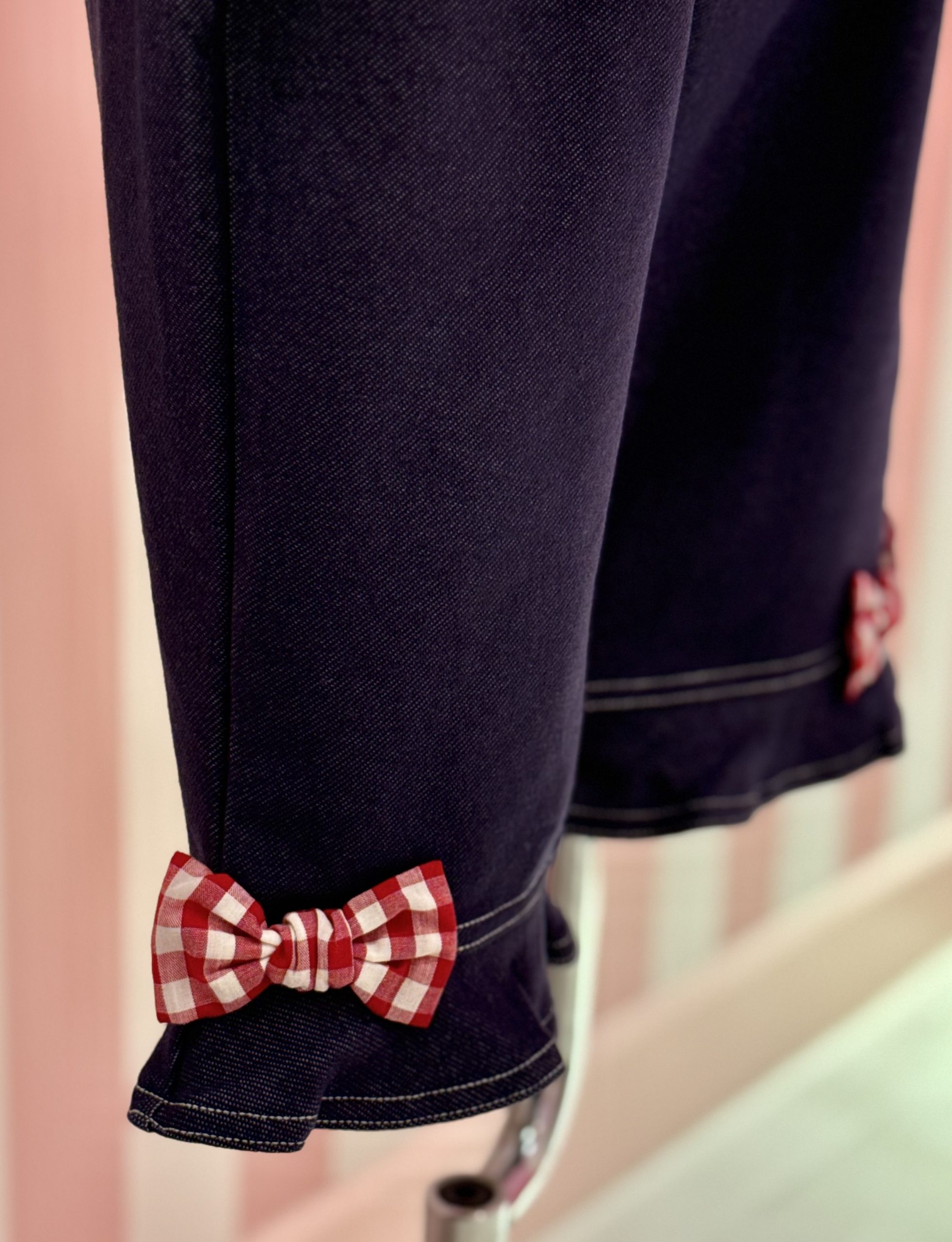 デニムニットパンツにもさりげななくギンガムチェックのリボンをトッピング![]()