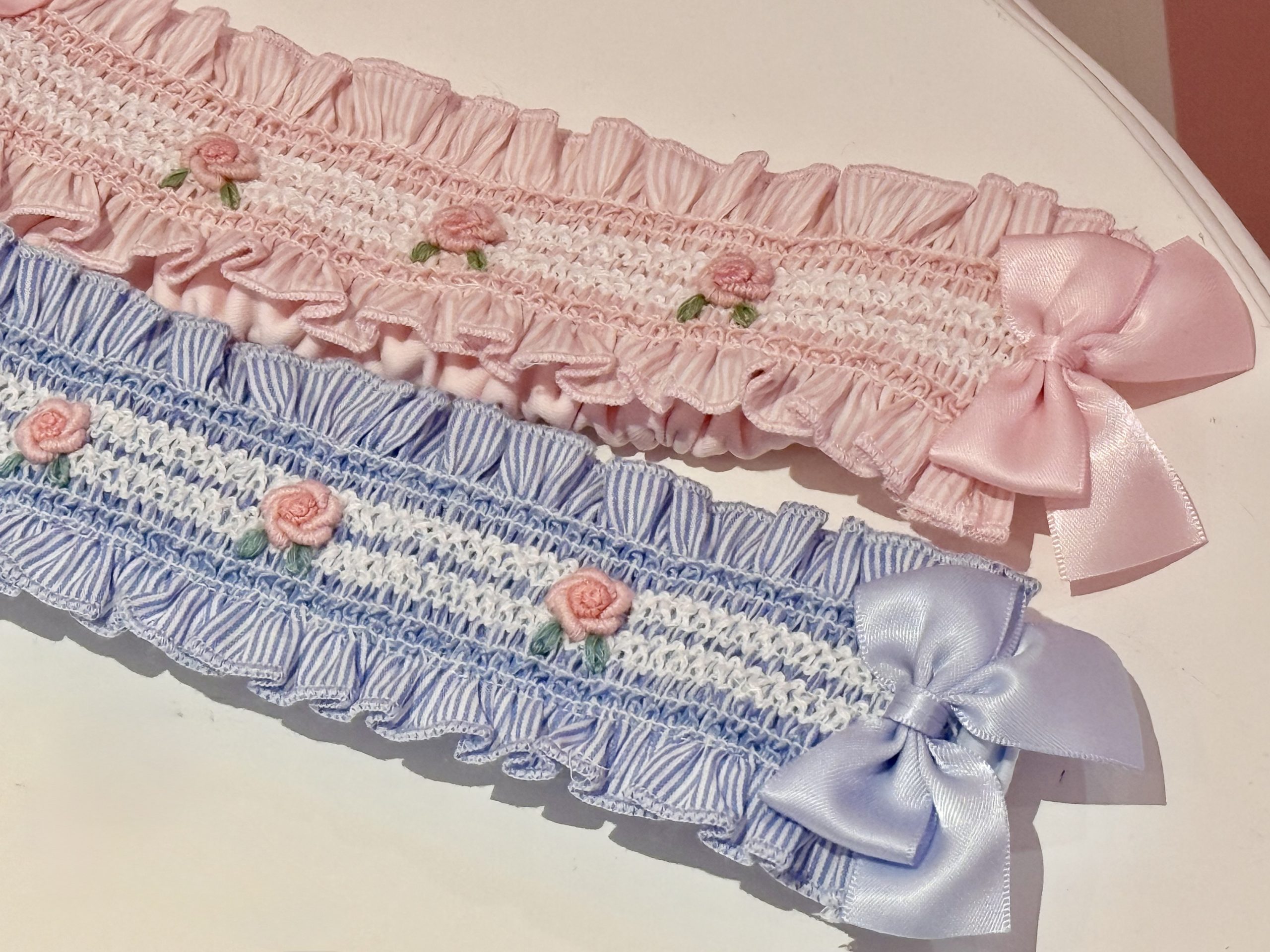 スモッキング刺繍の白い糸がレースの様ですね![]()