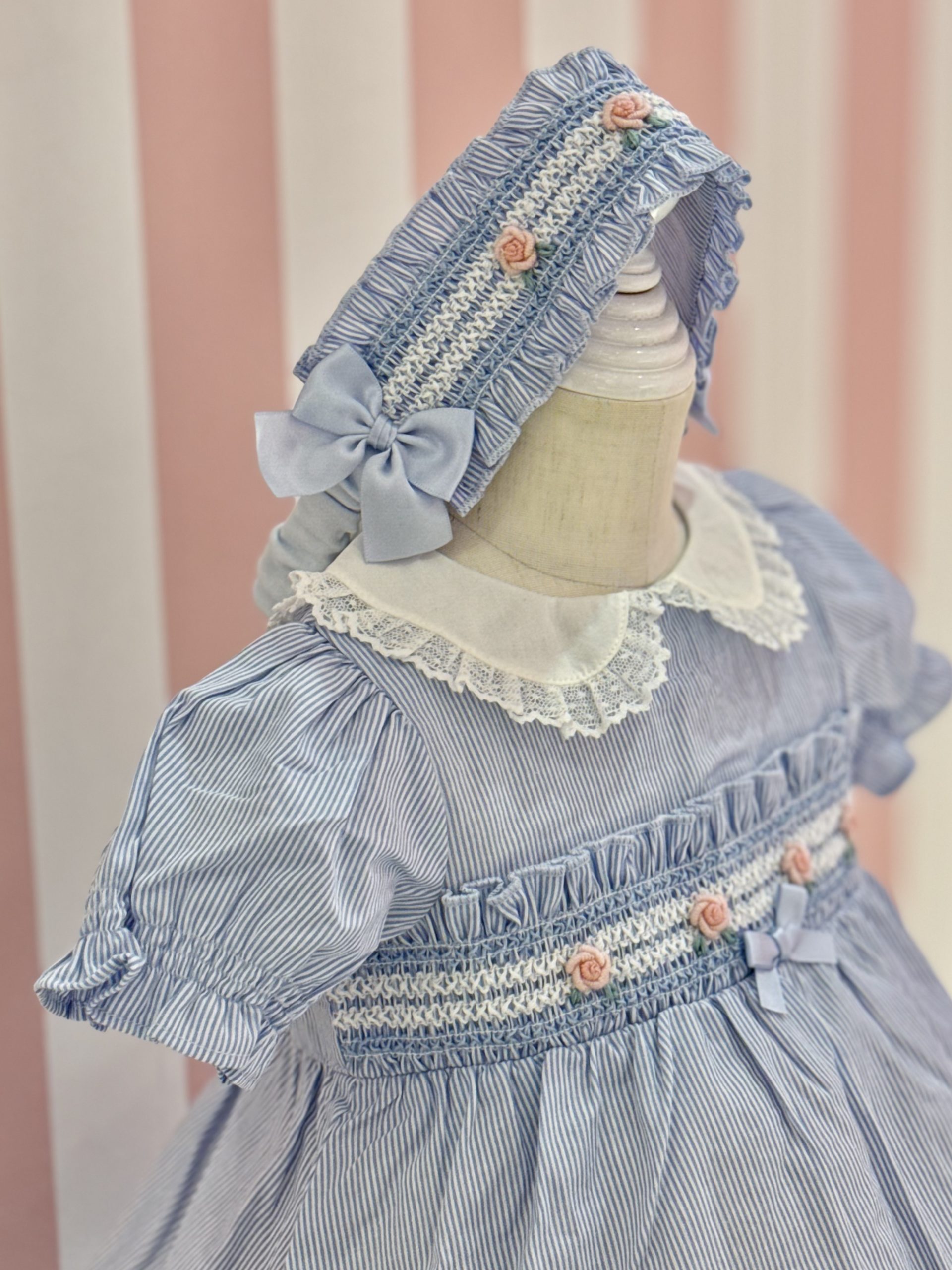 胸元のフリルはスモッキング刺繍と呼ばれるイギリスの伝統技法を